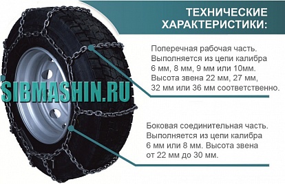 Цепи противоскольжения для грузовых автомобилей на сдвоенные (спаренные) колеса изготавливаются из цепей 6/6 мм, 8/6 мм и 8/8 мм (где первая цифра — калибр поперечной рабочей части цепи, вторая цифра — калибр боковой соединительной части цепи).